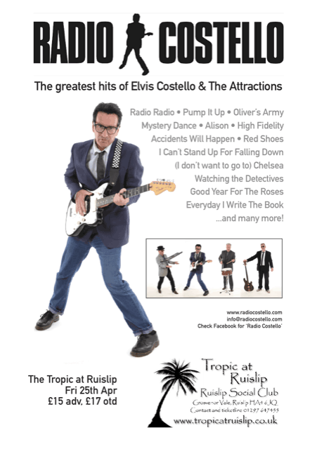 Our set is largely drawn from a classic quartet of albums – My Aim is True, This Year’s Model, Armed Forces and of course the amazing Get Happy. We have selected an amazing line up of hits with songs like Pump it Up, Oliver’s Army, Radio Radio, Red Shoes, and a host of others that you may have forgotten that you love.
